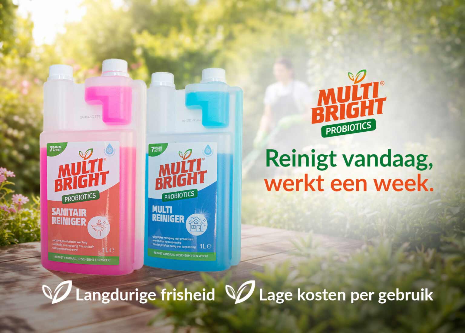 MultiBright reinigt niet alleen – het blijft tot 7 dagen actief dankzij probiotica. Waar traditionele schoonmaakmiddelen stoppen na het afnemen, blijven onze probiotica doorwerken op oppervlakken, in voegen en kieren. Ze verdringen schadelijke bacteriën en helpen opnieuw vuil worden verminderen. Het resultaat? Minder vaak schoonmaken, langer resultaat. Perfect voor drukke huishoudens én professionele omgevingen zoals horeca en facilitair.
